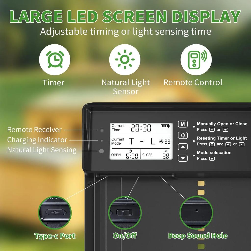 Автоматическая дверь курятника на солнечной энергии с ЖК-дисплеем, автоматическая дверь для кур с таймером и датчиком света - пульт дистанционного управления