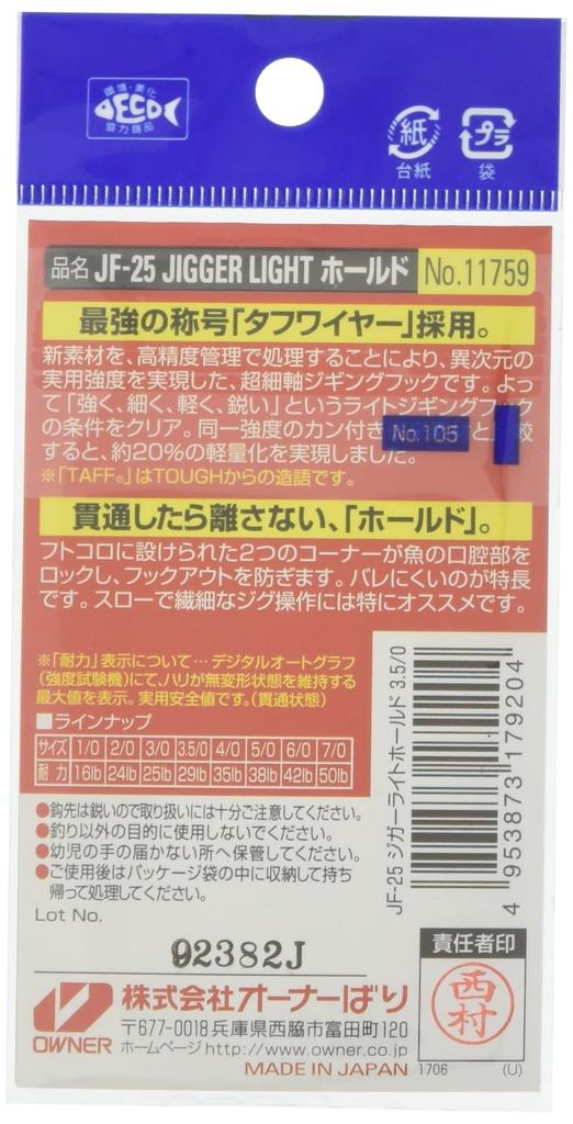 OWNER JF-25 Jigger Light Hold Hook No. 11759 #3.50 Fishing Hook