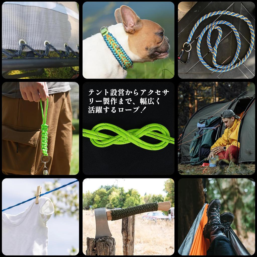 [Незаменимый предмет для использования на открытом воздухе и в помещении] Эта веревка для кемпинга может использоваться для крепления палаток, бельевых веревок, гамаков и навесов, а также для повседневного использования. Он также достаточно универсален, чтобы использоваться в качестве шнурков, веревок для качелей, ошейников и поводков для домашних животных и даже в качестве украшений для рукояток инструментов, таких как ножи и топоры.. Его универсальное использование варьируется от выживания, пешего туризма, охоты, рыбалки и приключенческих видов спорта до бытового использования.. Это идеальная многоцелевая веревка для любителей активного отдыха и энтузиастов DIY.