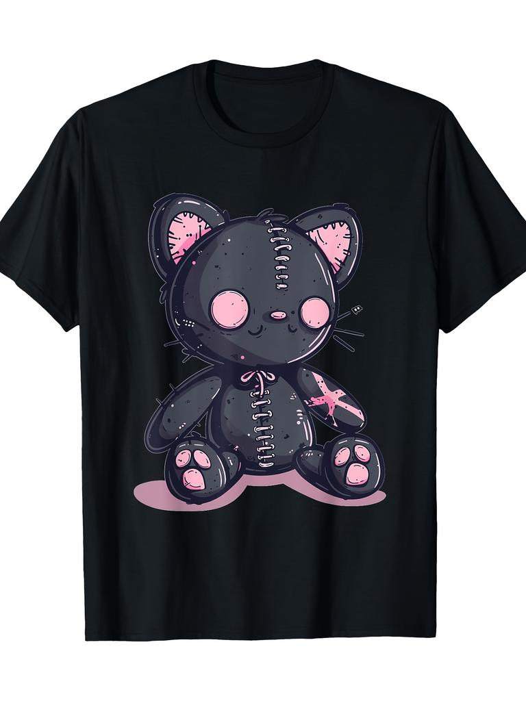 Женская и мужская готическая кавайная футболка с кошкой-куклой вуду, милая хоррор-черная футболка, повседневная свободная посадка, забавная модная футболка|Футболка в готическом стиле
