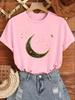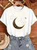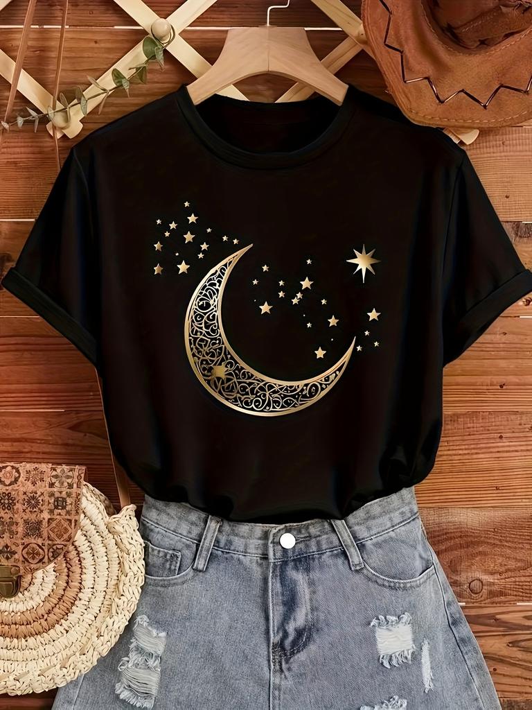 Женская элегантная футболка с принтом луны и звезд, повседневный топ с коротким рукавом и круглым вырезом для весны-лета, топ с золотистым принтом, удобная посадка