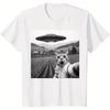 Футболка с принтом НЛО и кота Женская Мужская Летняя Повседневная Свободная Юмористическая С круглым вырезом С коротким рукавом Оверсайз Топ Футболка Унисекс