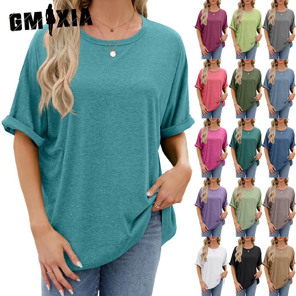 GMXIA Весенне-летняя однотонная футболка с круглым вырезом, свободного кроя, с короткими рукавами для женщин