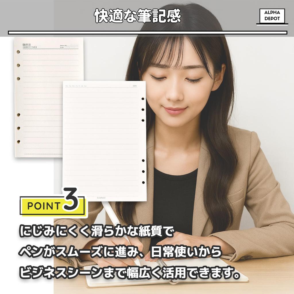 Выберите один из двух размеров! Формат A6 удобен и идеально подходит для заметок на ходу, а A5 просторный и идеально подходит для учебы или работы.. Выберите размер, который лучше всего соответствует вашим потребностям. Благодаря 240 листам, вы можете писать на нем для самых разных целей, от планирования встреч и учебы до записи идей для работы.. Сменные листы легко вставлять, и это также отлично подходит для блокнотов со стикерами! Наконечник ручки обеспечивает комфортное письмо без зацепок, снижая усталость даже после продолжительного письма.. Бумага, устойчивая к смазыванию, обеспечивает надежное использование. Конструкция с 6 отверстиями позволяет гибко переставлять и добавлять страницы, обеспечивая гибкое использование в блокнотах для записей, скрапбукинге и многом другом.. характеристики продукта: форма: Разлинованный блок для 6-кольцевых папок; Размер: A6 96 x 170мм, A5 145 x 210мм; Материал: Бумага; Количество листов: по 240 листов каждый; Вес: Неизвестный; Использует: Планировщик, дневник, тетрадь для учебы, управление расписанием