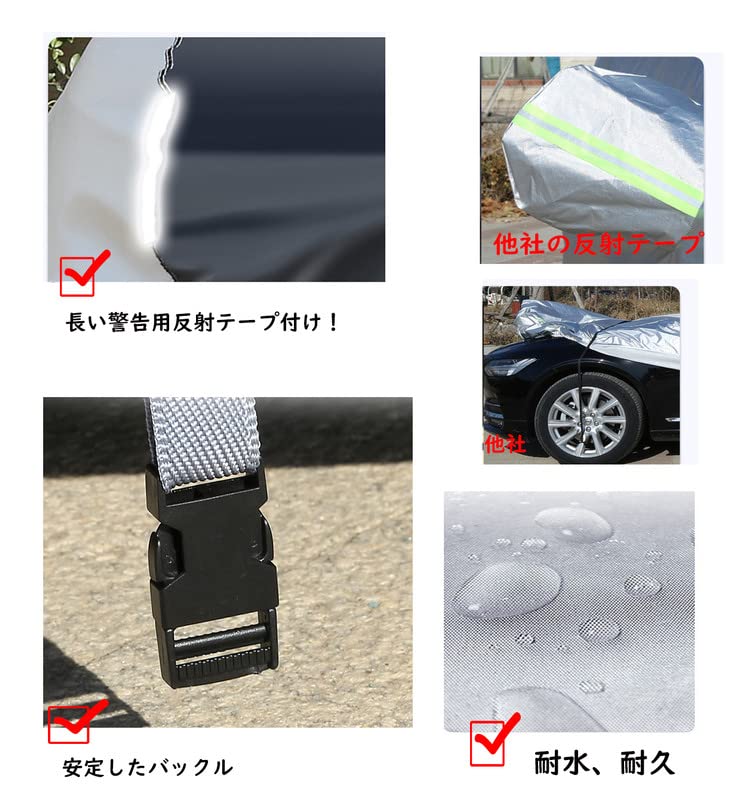 [Двойная защита с ветрозащитным ремнем] Обычные крепежные веревки чехла легко рвутся. Для решения этой проблемы мы используем прочный ветрозащитный трос. Даже при сильном ветре или тайфунах чехол для автомобиля не сдует.. [Простая установка] Спереди прикреплена длинная предупреждающая светоотражающая лента! Это особенно заметно! Боковая застежка делает его еще более удобным в использовании!