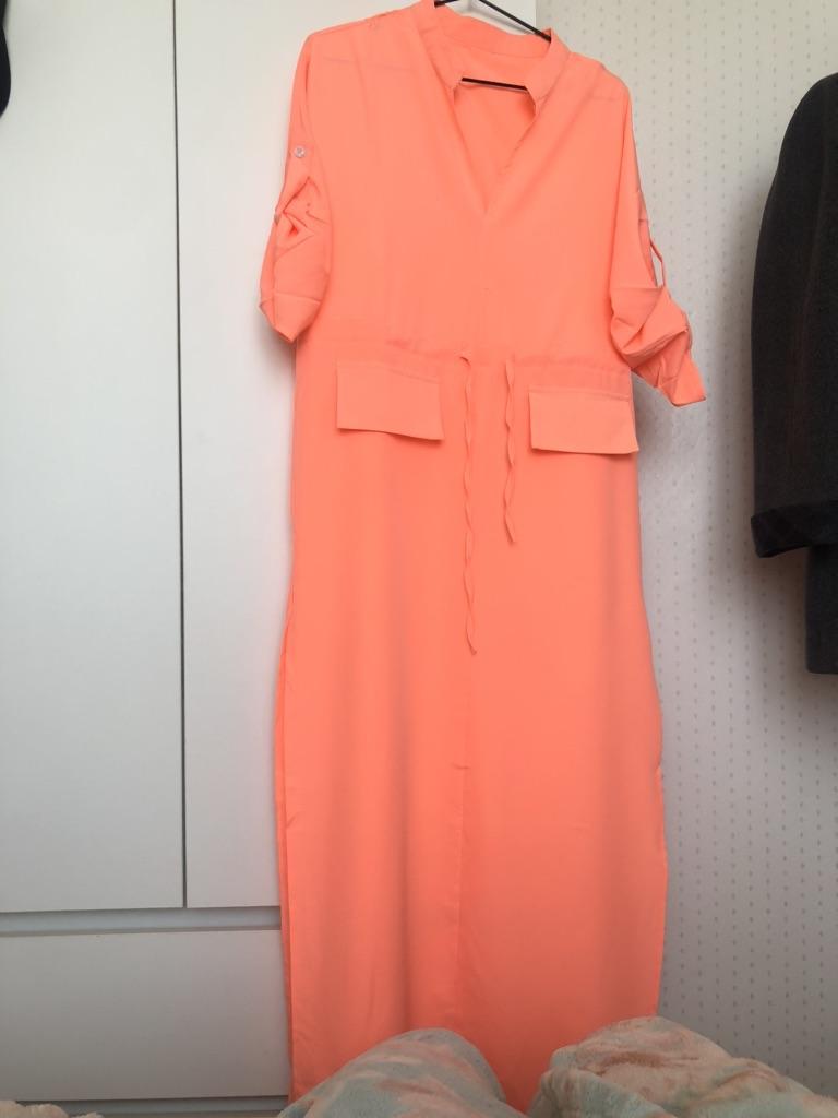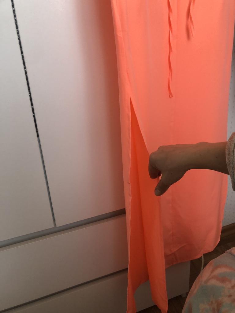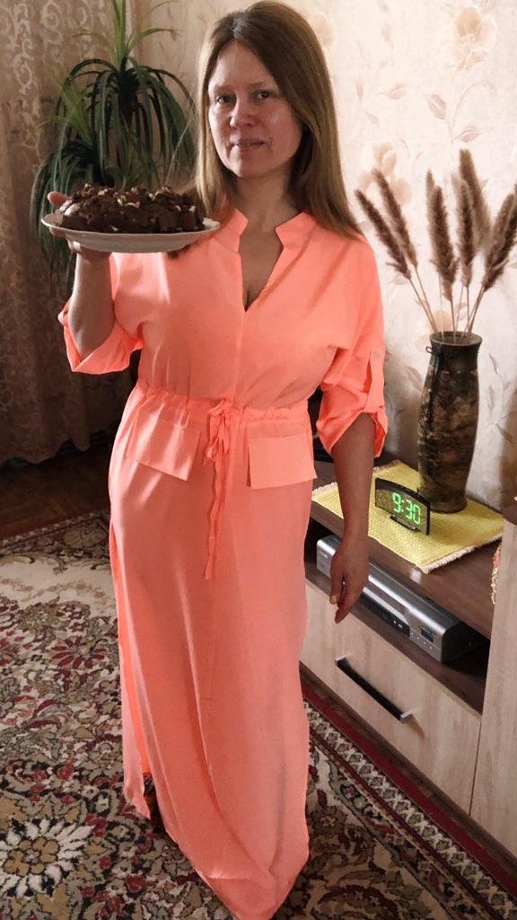 Платье симпатичное, особенно для дома, на море. Цвет не розовый, а какой-то лососевый с неоновым свечением (я бы так его описала), есть торчащие ниточки. Мой рост 152 длинна в пол, но я укорачивать не буду. Боковые разрезы на юбке глубокие, но не критично. Ткань полиэстер, есть этикетка. Зачем то клапаны от карманов пришили ?! Есть поясок на кулиске , у меня он оказался на талии. Цельнокройный рукава с патами. Мои параметры 96 - 76 - 93, заказала размер S. Можно было бы заказать это платье еще в синем цвете и на размер больше. Появилась мысль заказать платье повторно, значки потенциал у него есть🙂👍❤️