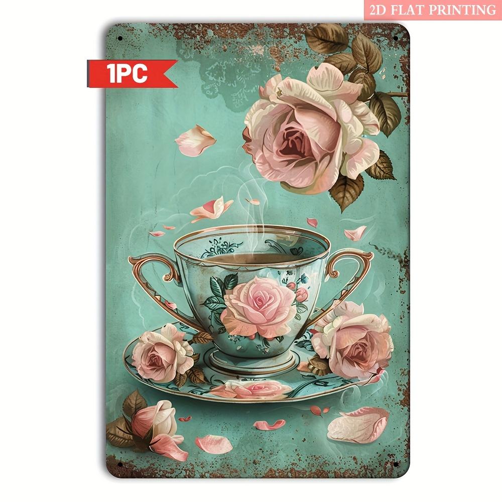 2D Плоский, Эстетика Винтажной Чайной Вечеринки, Настенное Искусство - 2D Плоский Принт на Металлической Жестяной Табличке, 8x12 Дюймов, Дизайн в Стиле Рустик с Чайником и Розами для Ca