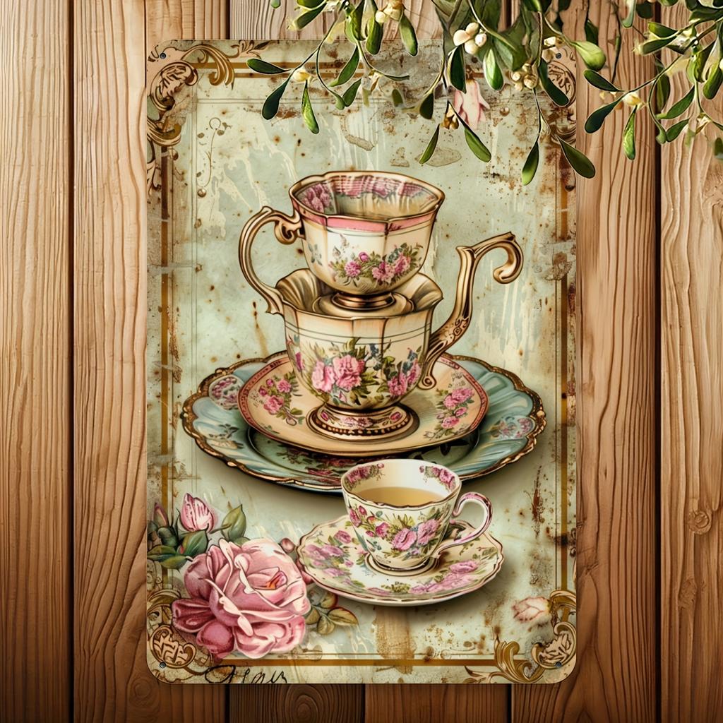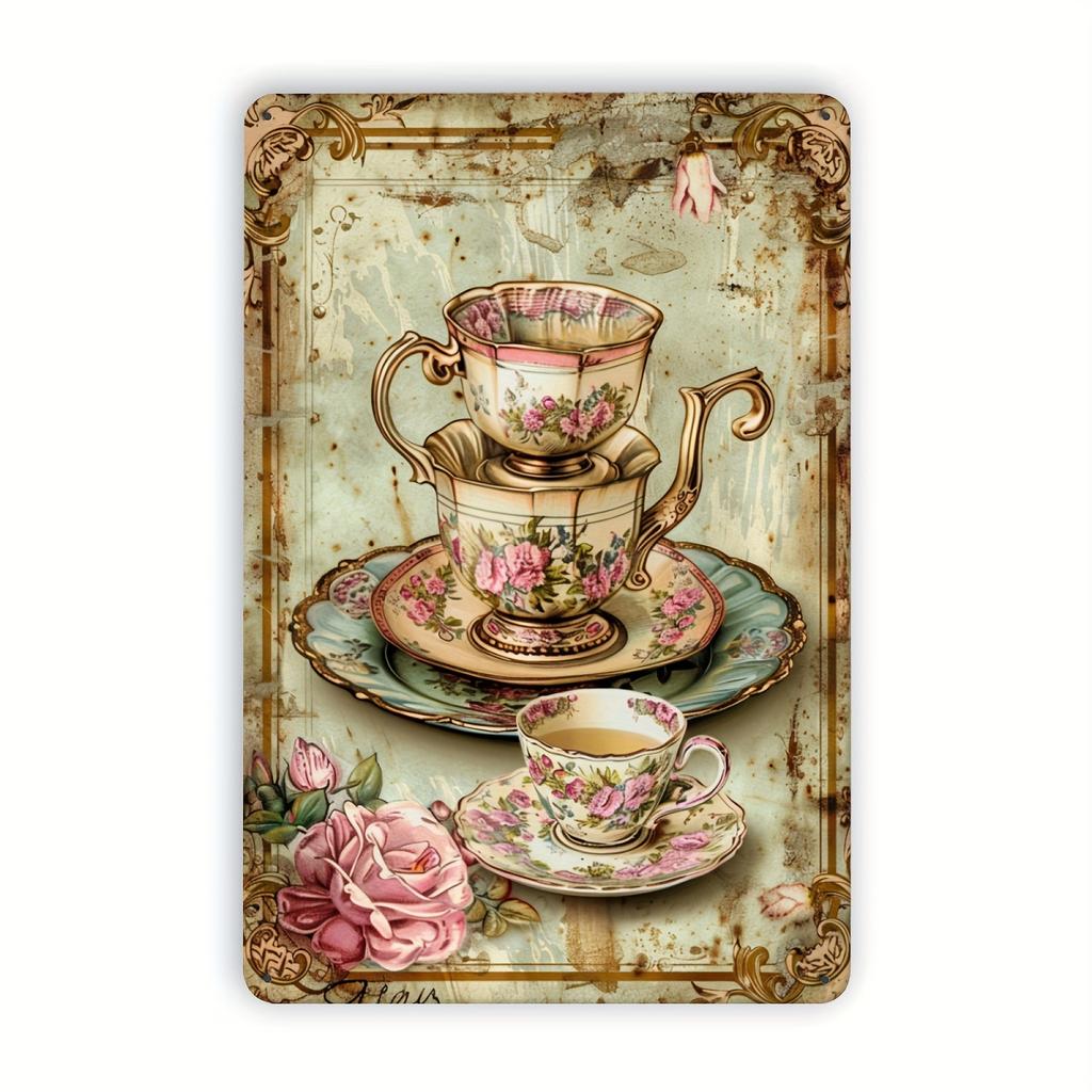 Винтажные цветочные чайные чашки Металлическая жестяная табличка - Идеально для чайных комнат и кофеен, Классический декор, 20,32x30,48 см