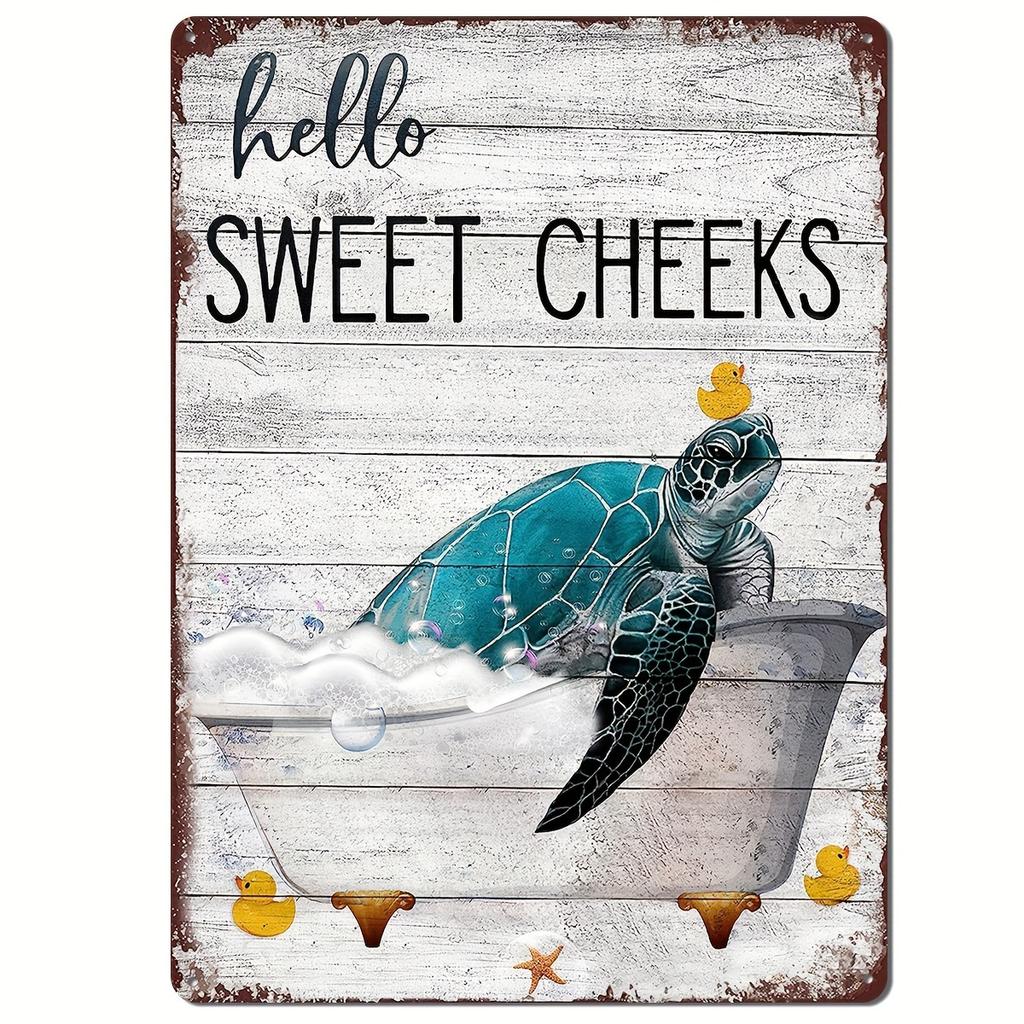 1 шт. Забавная морская черепаха в ванне Ретро жестяная табличка - Винтажное металлическое настенное искусство "Hello SWEET CHEEKS" с бирюзовой черепахой, резиновыми уточками и бу