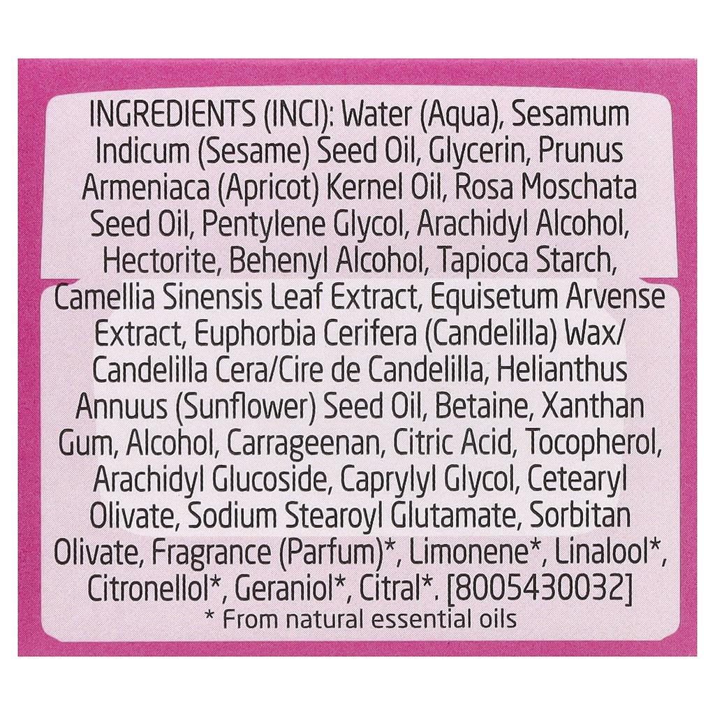 Ингредиенты: Очищенная вода, кунжут (Кунжут индикум) масло, глицерин, абрикос (Чернослива армянская) масло косточек, Rosa moschata (Роза мускатная) масло семян, пентиленгликоль, арахидиловый спирт, гекторит, бегениловый спирт, тапиоковый крахмал, зеленый чай (чайный куст) экстракт листьев, хвощ (Equisetum arvense) экстракт, канделилла (Эуфорбия церефера) воск, подсолнечник (Подсолнечник однолетний) масло семян, бетаин, ксантановая камедь, спирт, каррагинан, лимонная кислота, токоферол, арахидил глюкозид, каприлилгликоль, цетеарилоливат. Стеароилглутамат натрия, Оливат сорбитана, Отдушка*, Лимонен*, Линалоол*, Цитронеллол*, Гераниол*, Цитраль*. * Этот продукт содержит ингредиенты, полученные из натуральных эфирных масел. Не содержит сырье животного происхождения. Мы не можем гарантировать, что оно не соприкасалось с невеганскими ингредиентами в процессе производства.