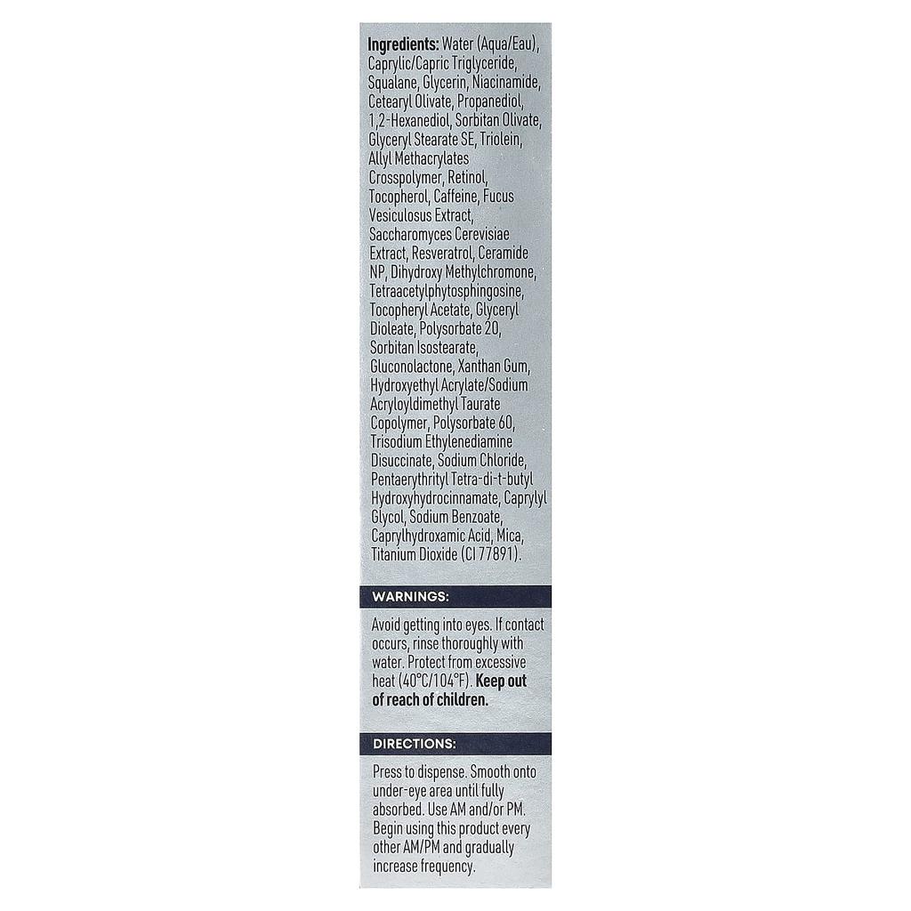 Ингредиенты: Очищенная вода, каприловый/каприновый триглицерид, сквалан, глицерин, ниацинамид, цетеарилоливат, пропандиол, 1,2-гександиол, сорбитаноливат, глицерилстеарат SE, триолеин, аллилметакрилатный кроссполимер, ретинол, токоферол, кофеин, фукус пузырчатый (Фукус пузырчатый) экстракт, пивные дрожжи (Saccharomyces cerevisiae) экстракт, ресвератрол, церамид NP, дигидроксиметилхромон, тетраацетил фитосфингозин, токоферил ацетат, глицерил диолеат, полисорбат 20, сорбитан стеарат, глюконолактон, ксантановая камедь, сополимер гидроксиэтилакрилата/акрилоилдиметилтаурата натрия, полисорбат 60, этилендиамин дисукцинат тринатрия, хлорид натрия, пентаэритритил тетра-ди-трет-бутил гидроксигидроциннамат, каприлилгликоль, бензоат натрия, каприлгидроксамовая кислота, слюда, диоксид титана (CI 77891). Произведено в США из импортных ингредиентов.