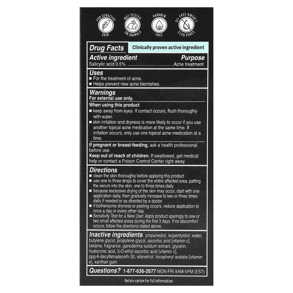 Ингредиенты: Информация о лекарстве: Активный компонент: Салициловая кислота 0,5%, Лечение акне: Другие ингредиенты: Пропандиол, Изопентилдиол, Очищенная вода, Бутиленгликоль, Пропиленгликоль, Аскорбиновая кислота [Витамин C], Бетаин, Отдушка, Экстракт гриба Рейши, Глицерин, Гиалуроновая кислота, 3-O-этил-аскорбиновая кислота [Витамин C], ППГ-6-децилтетрадецет-30, Силантриол, Токоферилацетат [Витамин E], Ксантановая камедь.