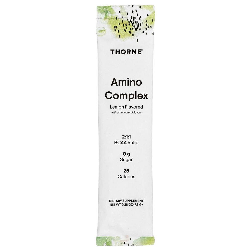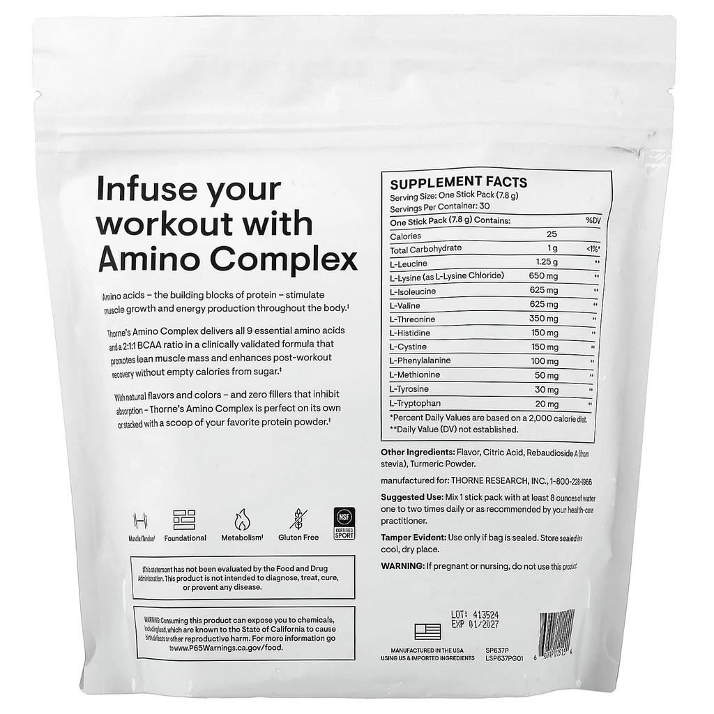 Product Description: 2:1:1 BCAAs with other natural flavors, 0g sugar, 25 calories, supplement, muscle/tendon strength, foundational health, metabolism, gluten-free, NSF Sport certified, workout with an amino complex. Amino acids, the building blocks of protein, stimulate muscle growth and fuel your body's energy production. Thorne's Amino Complex provides all nine essential amino acids and a 2:1:1 BCAA ratio in a clinically proven formula to promote lean muscle mass and accelerate post-workout recovery without the empty calories from sugar. It uses natural flavors and colors and contains no bulking agents that inhibit absorption. Thorne's Amino Complex is made on its own or with a scoop of protein powder.