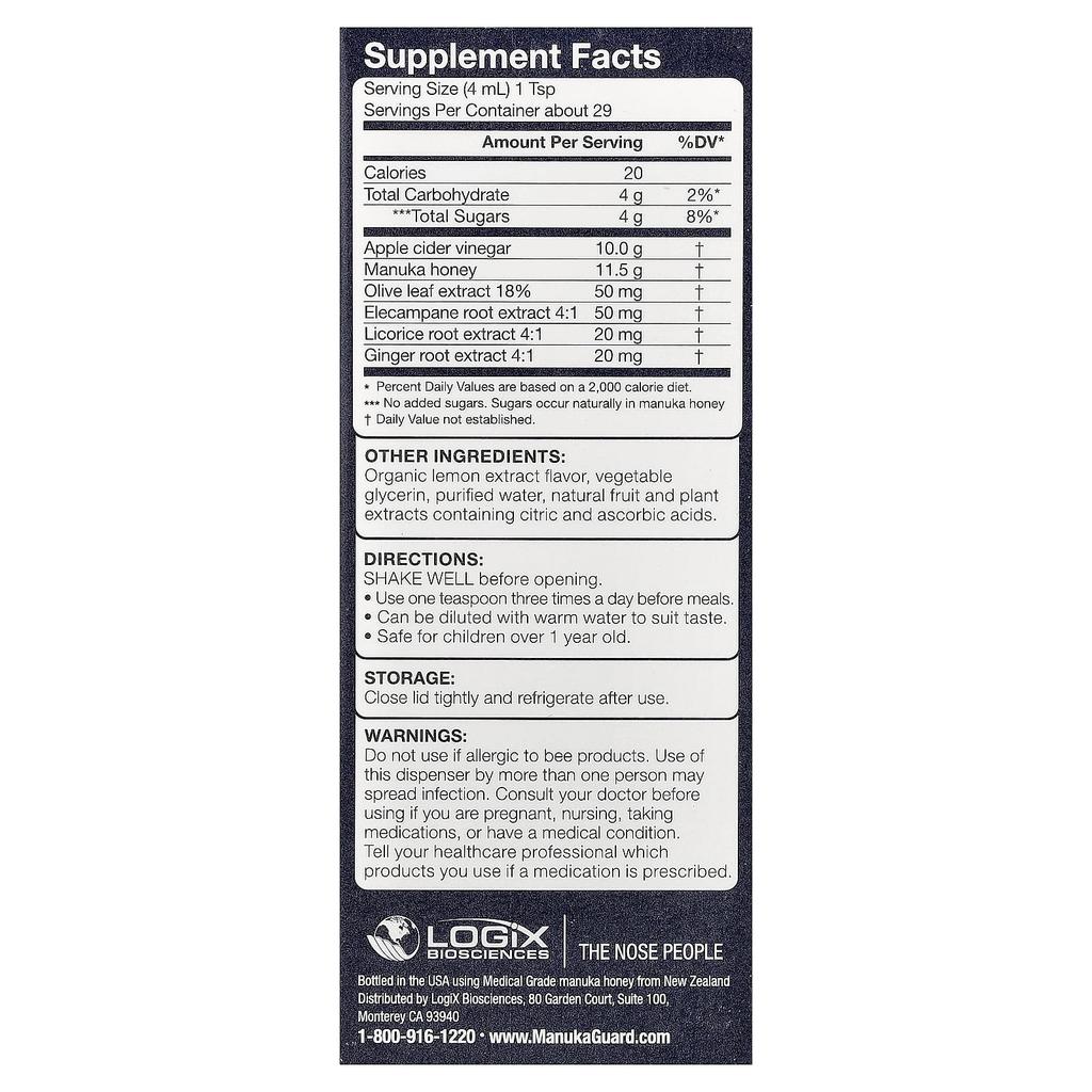 Ингредиенты: Органический экстракт лимона, ароматизатор, растительный глицерин, очищенная вода и натуральные фруктовые/растительные экстракты, содержащие лимонную кислоту и аскорбиновую кислоту (Витамин С). Сделано в США с медом манука, полученным из Новой Зеландии.
