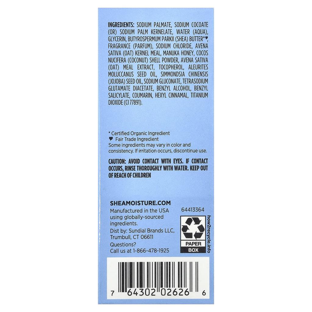 Ингредиенты: Пальмат натрия, кокоат натрия (или) Натрия Пальмоядровое, Вода, Глицерин, Ши (Butyrospermum parkii) Масло*, Ароматизатор, Хлорид натрия, Овес (Авена Сатива) Мука из ядер, Мёд манука, Cocos Nucifera (Кокос) Порошок шелухи овса (Авена Сатива) Порошковый экстракт, Токоферол, Масло семян Aleurites Moluccana, Жожоба (Симмондсия китайская) Масло семян, Глюконат натрия, Диацетат глутамата тетранатрия, Бензиловый спирт, Бензилсалицилат, Кумарин, Гексилциннамаль, Диоксид титана (CI 77891). *Сертифицированные органические ингредиенты ♥ Сделано в США с импортными ингредиентами справедливой торговли.