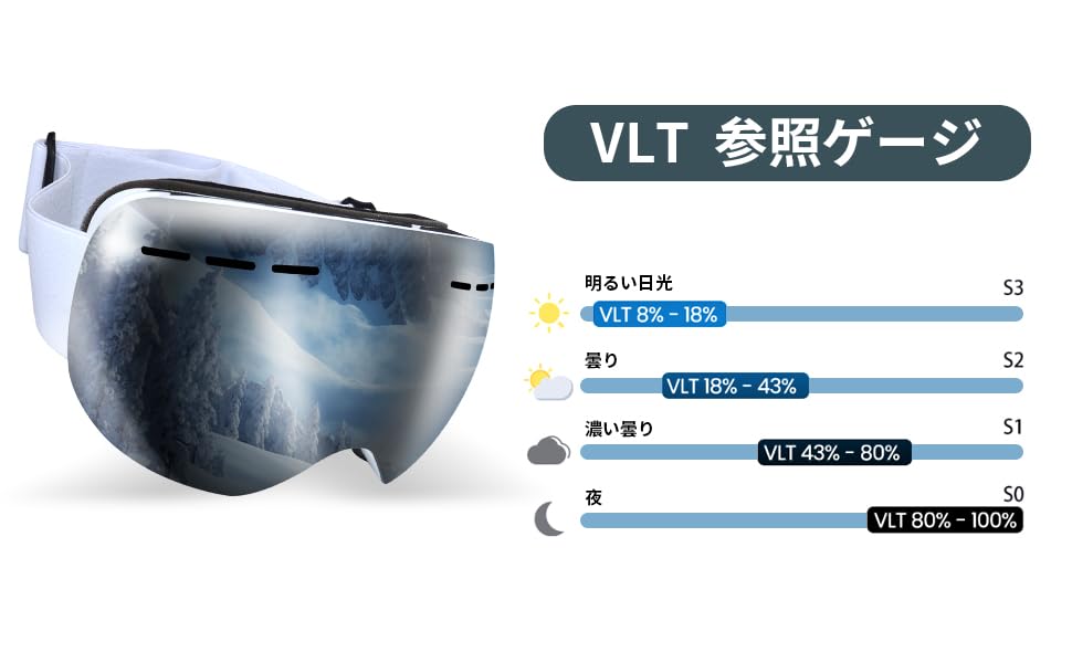 Подходящие для любых погодных условий, эти горнолыжные очки имеют уровень прозрачности S3, а линзы автоматически регулируют прозрачность, позволяя вам видеть четко даже в условиях плохой видимости или при слабом освещении, что делает их подходящими для любых погодных условий.