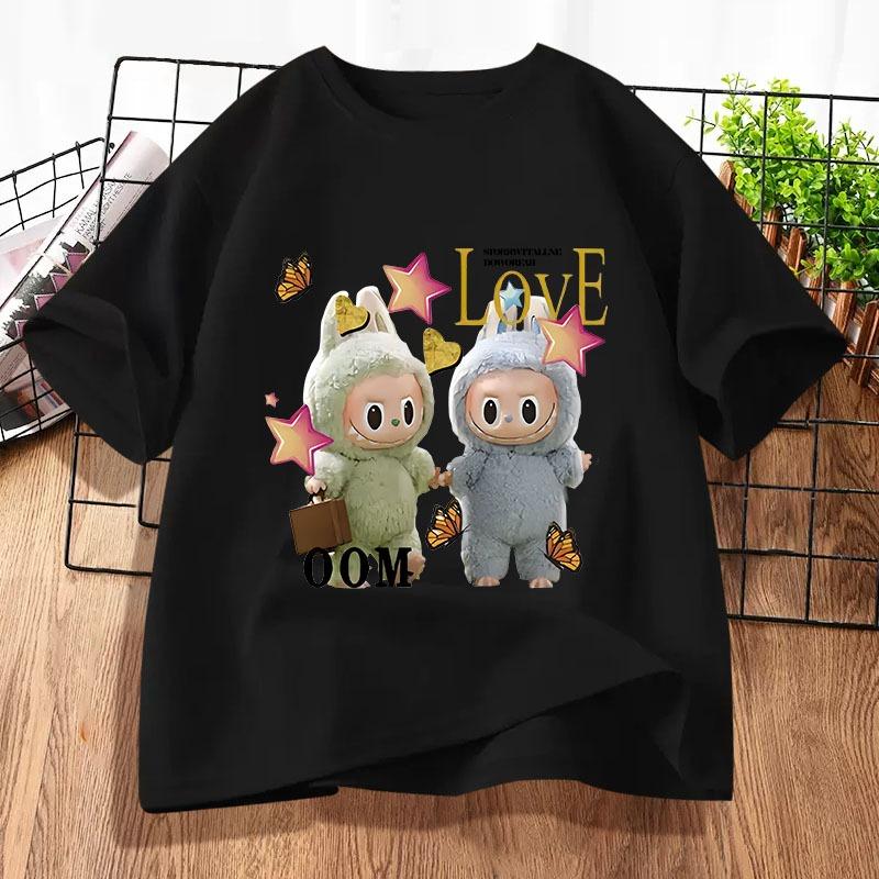 Милая футболка с мультяшным принтом Лабубу, летняя новинка, детская футболка с круглым вырезом и короткими рукавами, подходит для девочек в возрасте 4-14 лет
