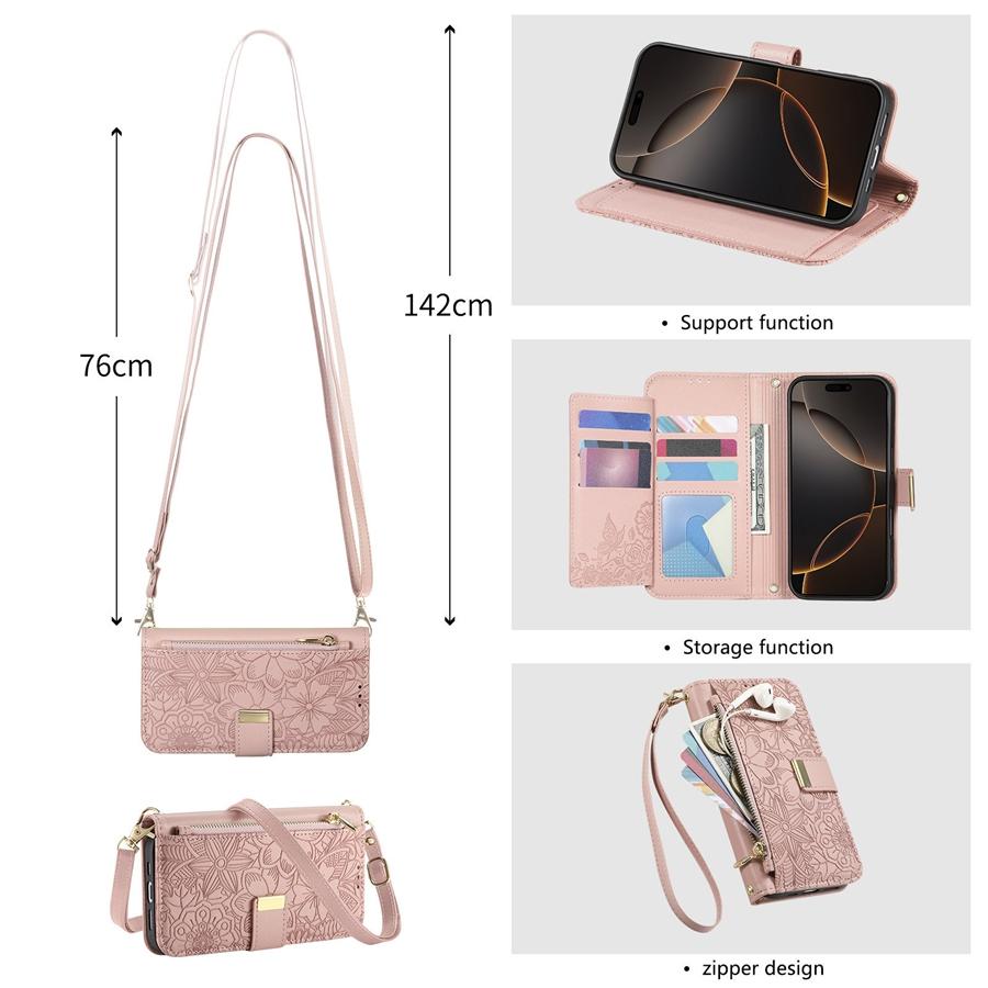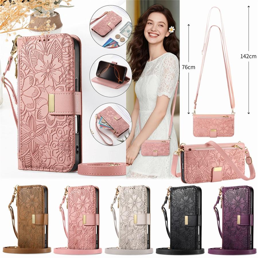 Чехол-кроссбоди из ПУ-кожи с цветочным тиснением 3-в-1 для OPPO/VIVO/Redmi 6 слотов для карт + карман на молнии для монет + подставка и съемный длинный плечевой ремень