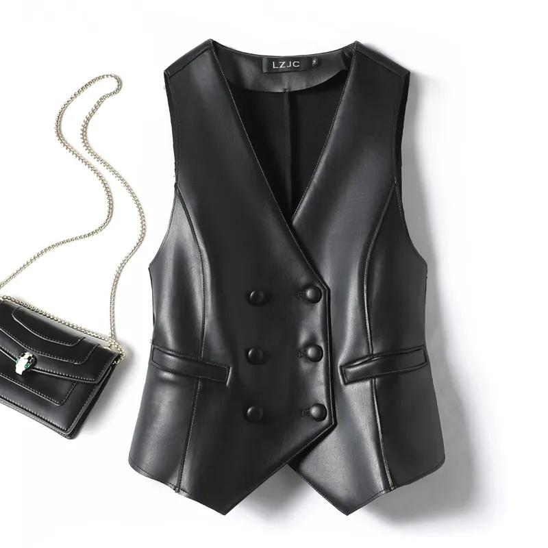 Женская верхняя одежда Весна Осень Черный Мягкий жилет из искусственной кожи Двубортный Элегантный Офисный леди Безрукавные куртки Жилет