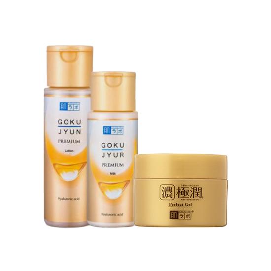 Этот полный набор для увлажнения кожи сочетает в себе культовый лосьон, молочко и гель-крем Hada Labo Gokujyun Premium для многослойного увлажнения.