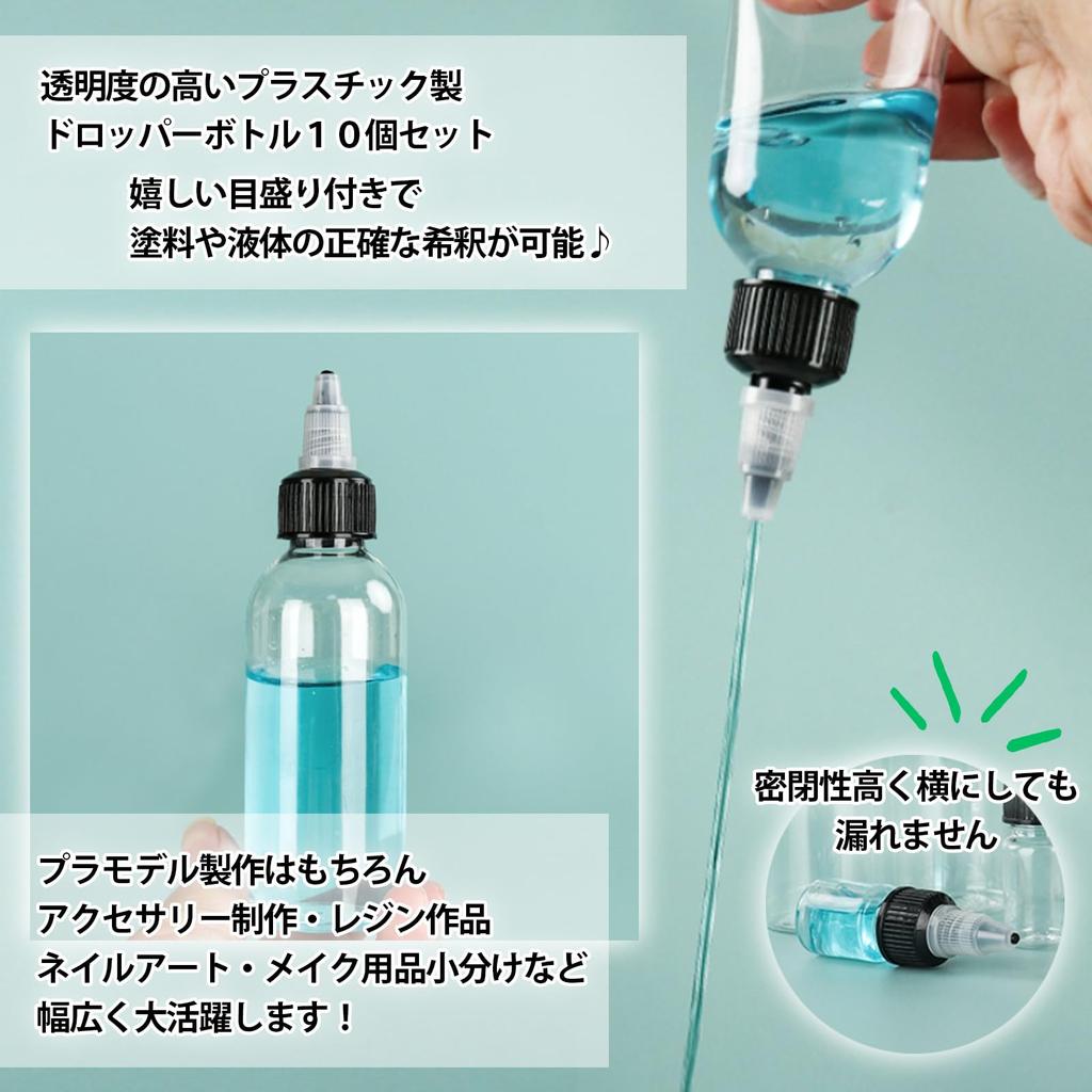 Эти бутылочки можно использовать для широкого спектра целей, включая изготовление пластиковых моделей, изготовление аксессуаров, проекты из смолы, нейл-арт и разделение косметических продуктов.. Набор из 10 бутылочек также позволяет одновременно работать с несколькими цветами и типами жидкостей, расширяя сферу ваших увлечений.