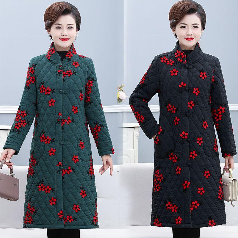 Хлопковое пальто с вышивкой в китайском стиле для женщин среднего возраста, утепленная теплая длинная куртка с застежками-лягушками