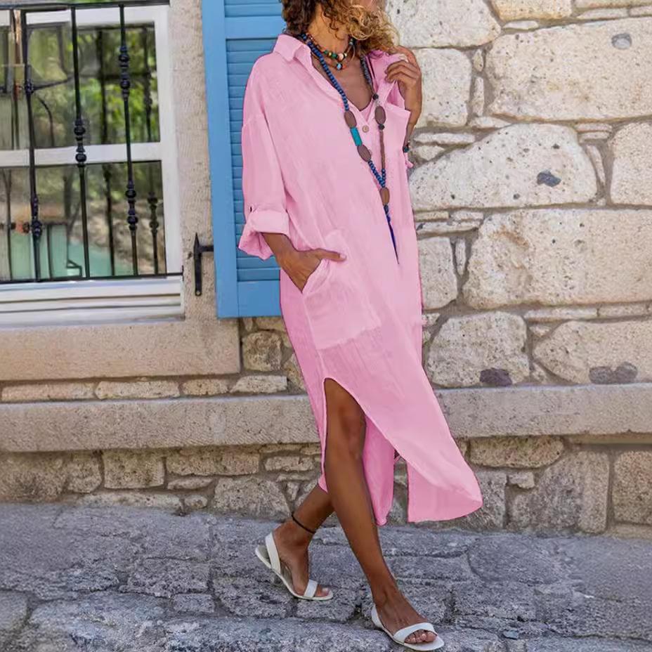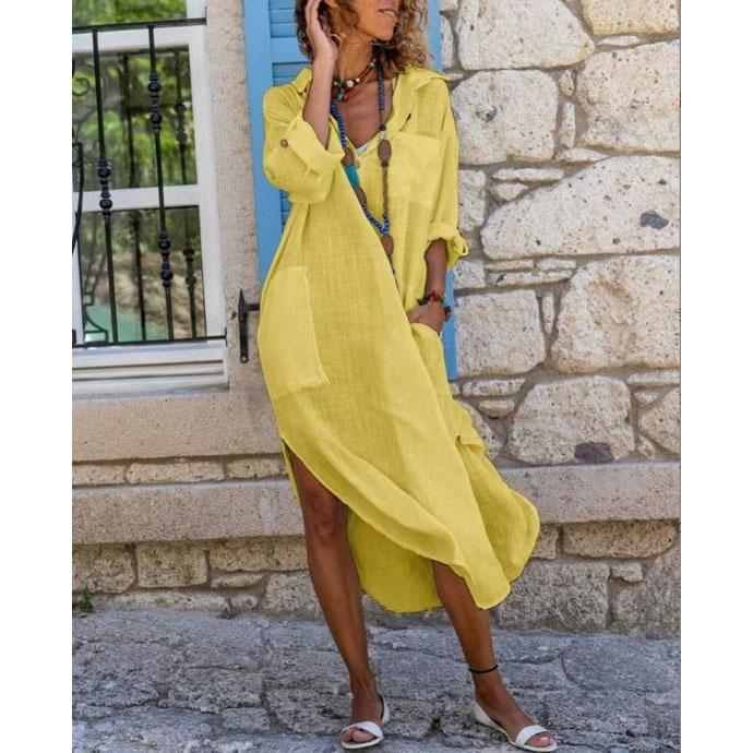 Платье-рубашка для женщин Лен Хлопок Одежда Весна Лето Повседневное Винтажное Свободное Чистые Длинные Миди Платья