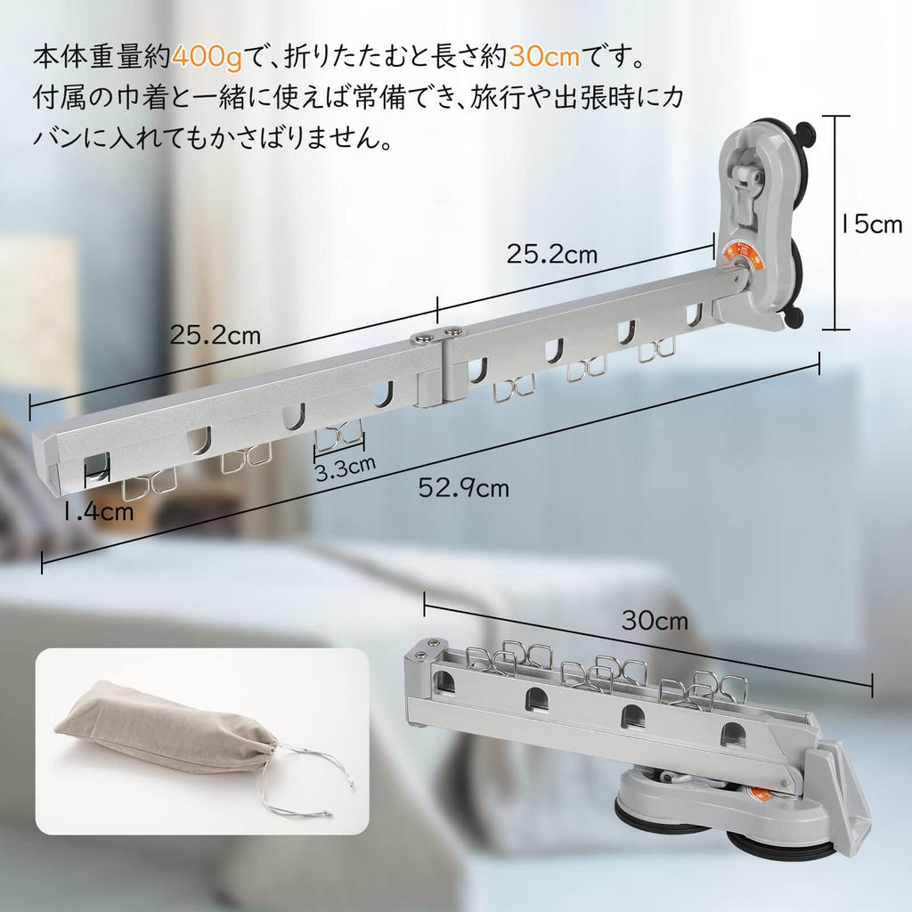 [High Load Capacity] The double locking mechanism allows for a weight capacity of 4kg. It can easily hang even heavy, wet down jackets and jackets. It measures 53.2cm when extended, has eight hanger holes, and six clips. It can hold up to eight pieces of clothing or six pairs of socks. It easily accommodates two days' worth of clothes or two people's worth of clothes. [Caution] Our wall hangers are suitable for use on smooth surfaces such as tile, glass, and metal. Do not use on wallpaper, painted, or coated walls.