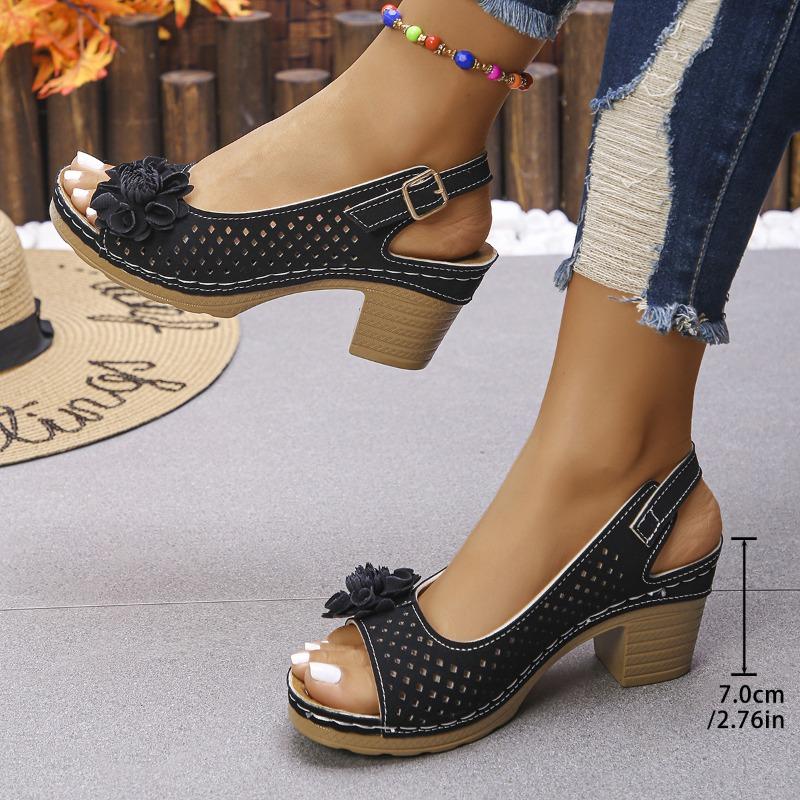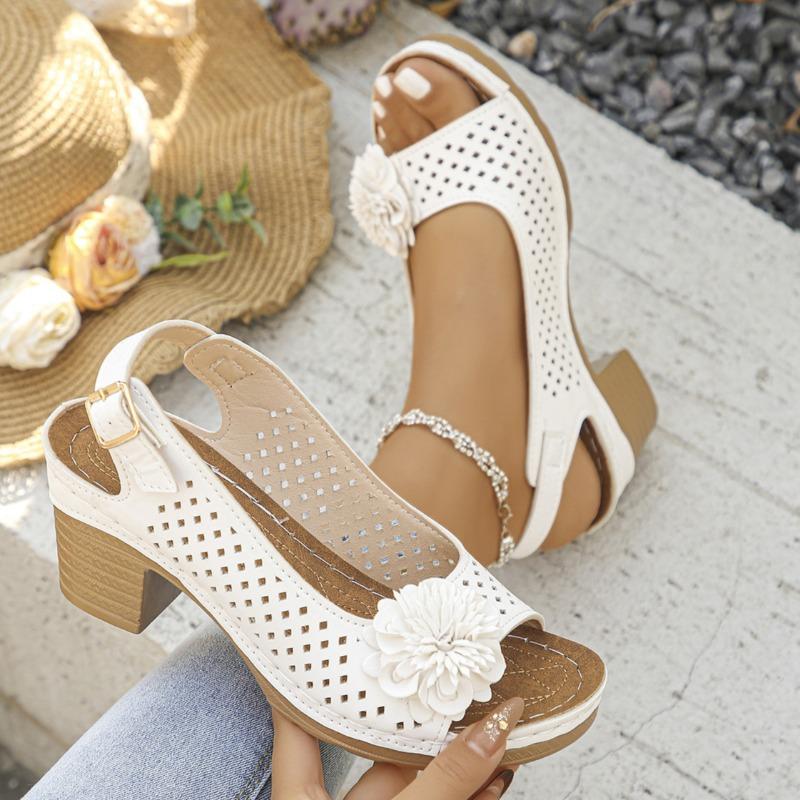 Летние новые женские босоножки на толстом каблуке с наклонной подошвой, цветочная декоративная пряжка в стиле кэжуал с однотонными римскими сандалиями
