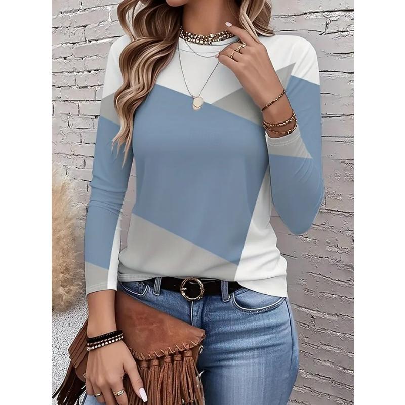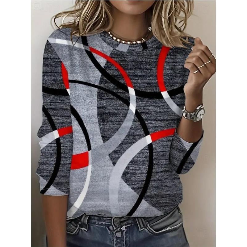Женская футболка с длинным рукавом, круглым вырезом, туника с длинным рукавом, современная повседневная, с геометрическим принтом, обычные топы