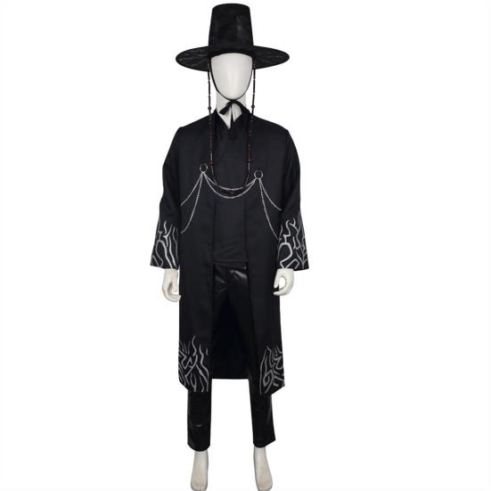 Уникальный костюм для косплея: Окунитесь в темное очарование с этим поразительным костюмом для косплея, вдохновленным корейскими аниме-персонажами.. Наряд включает в себя халат с узором черного пламени, шляпу в традиционном стиле, многослойные цепи и детализированные аксессуары для аутентичного и смелого сценического представления.