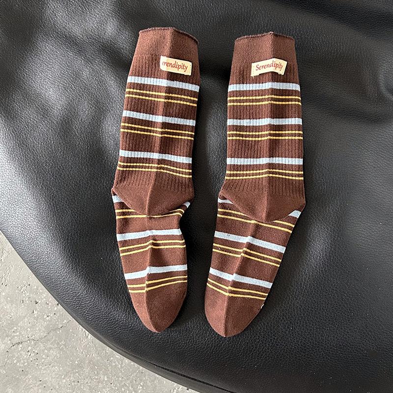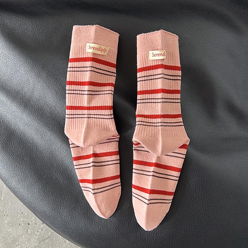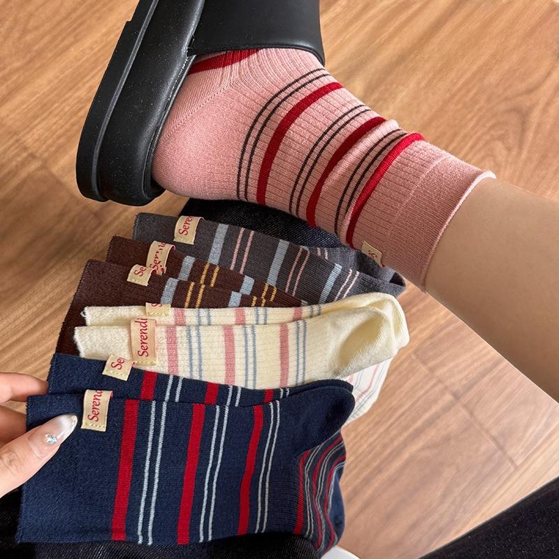 Женские весенне-осенние повседневные носки в тонкую полоску, с тканевой этикеткой на пятке, бесшовные, средней длины, из хлопка