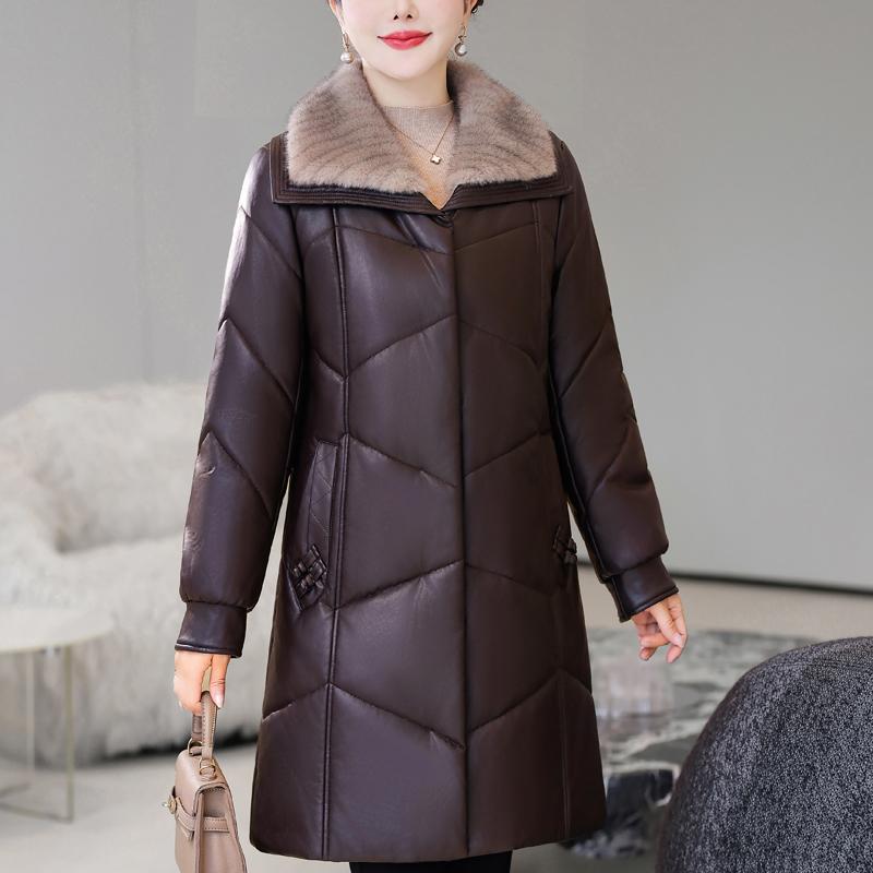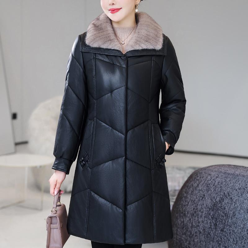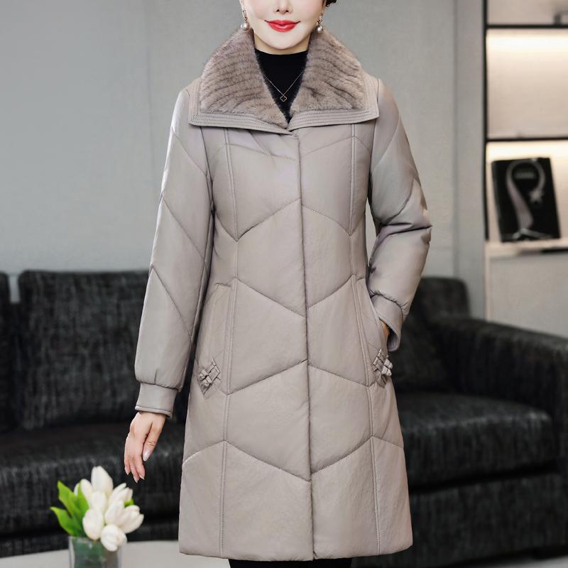 Зимнее длинное пальто из искусственной овчины для женщины среднего возраста с меховым воротником, элегантная теплая зимняя парка, женская кожаная куртка