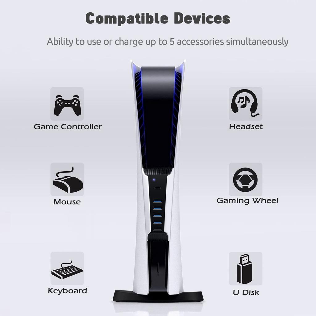 Подключайте USB-периферийные устройства, такие как клавиатуры, мыши и зарядные устройства для контроллеров, чтобы максимально удовлетворить различные потребности вашей консоли PlayStation 5.. (уведомление: Только черный USB-порт поддерживает быструю зарядку.)