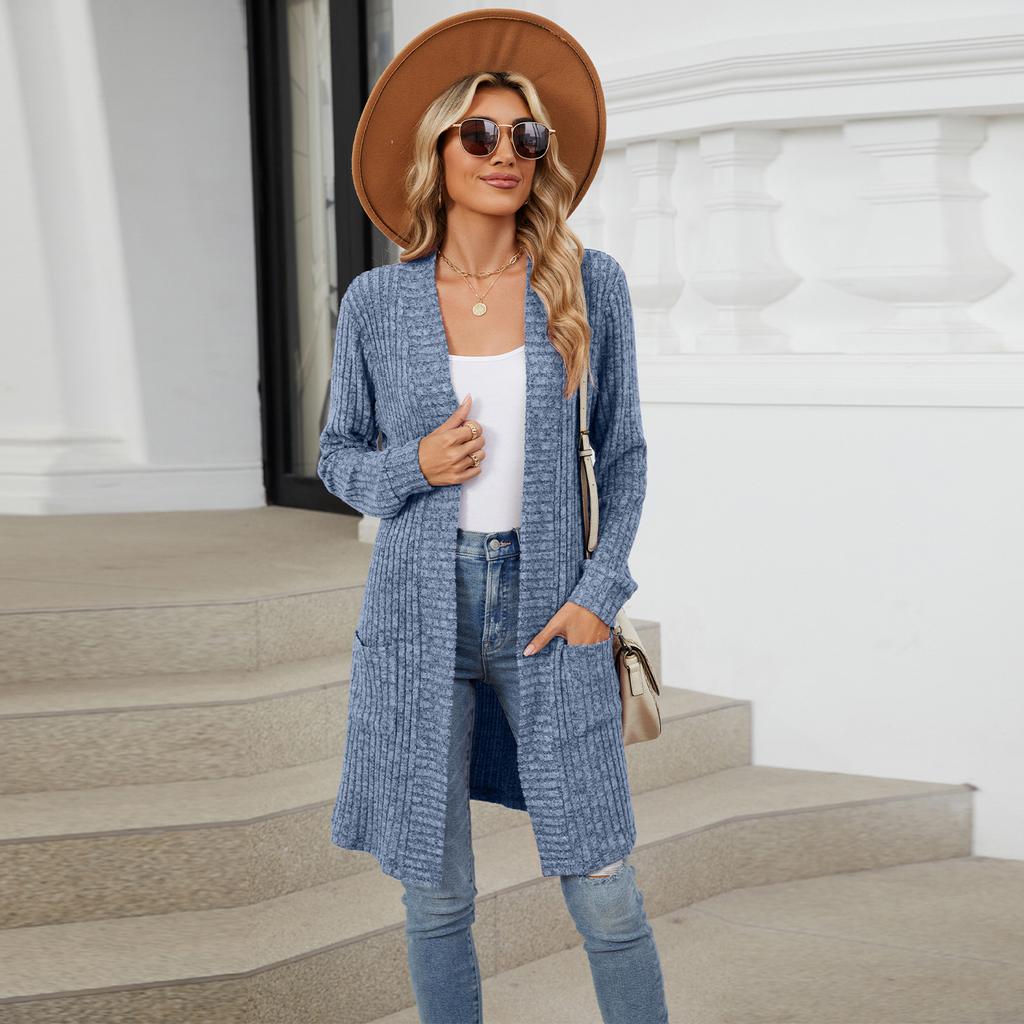 Женский длинный однотонный кардиган-жакет с длинными рукавами, свободного кроя и карманами