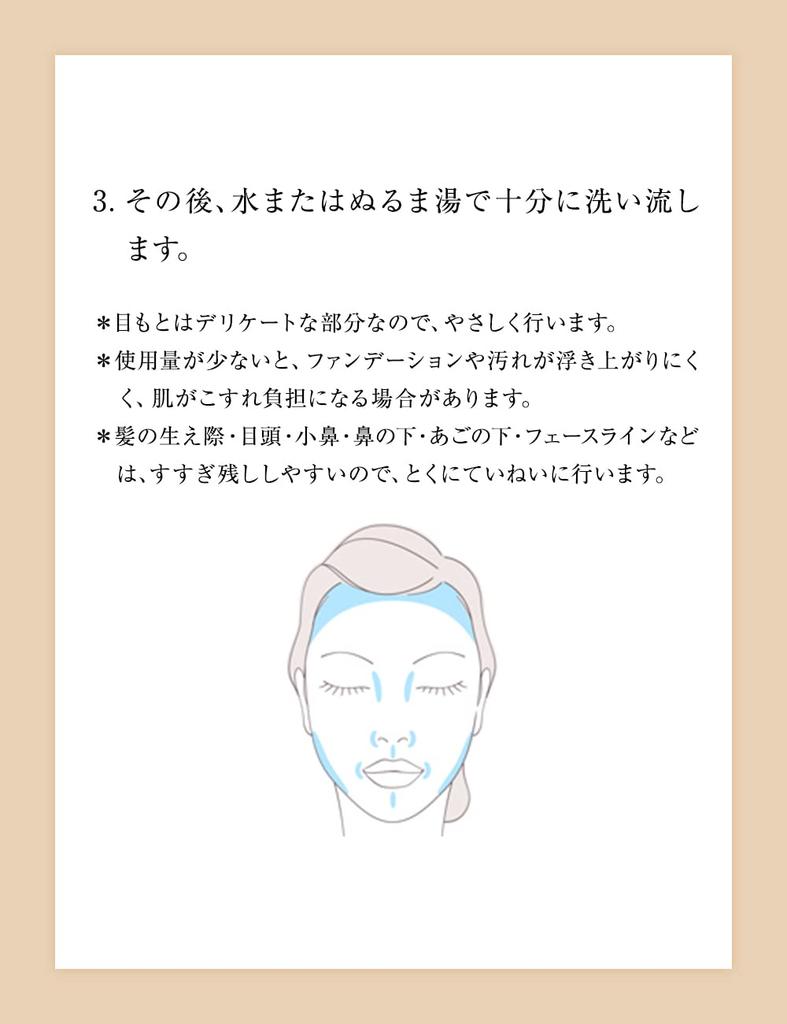 This rich cream thoroughly envelops and removes makeup stuck deep within the skin's texture and pores. It loosens the roughness of the skin's surface (stratum corneum) while thoroughly protecting moisture. It leaves the skin feeling moisturized and smooth after use. It can be wiped off or rinsed off.