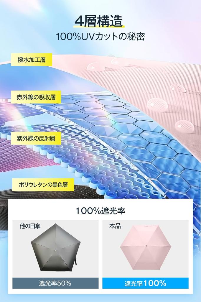 [4-слойная конструкция и зонт от солнца и дождя] Этот зонт имеет 4-слойную конструкцию. Внешний слой водоотталкивающий, быстро отталкивает дождь, легкий и удобный в использовании.. Средний слой поглощает инфракрасные лучи и отражает ультрафиолетовые лучи, обеспечивая отличную защиту от УФ-излучения. Внутренняя часть изготовлена из черного резинового композитного материала, который отражает часть ультрафиолетовых лучей и теплового излучения и предотвращает проникновение или прилипание воды и грязи.. Это облегчает чистку. Эта конструкция обеспечивает лучшую защиту, чем обычный зонт, будь то солнечно или дождливо.