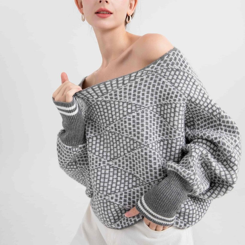 Свитер из шерсти с одним вырезом, Вязаный свитер в клетку с длинным рукавом, Пуловер, Женская верхняя одежда с открытыми плечами