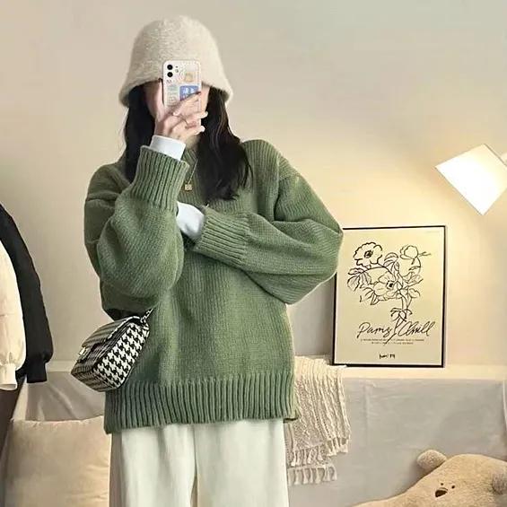 Пуловер свободного кроя с круглым вырезом, зеленый, для женщин, осенне-зимний, толстый, в стиле ретро, японский ленивый стиль, внутренний базовый вязаный топ