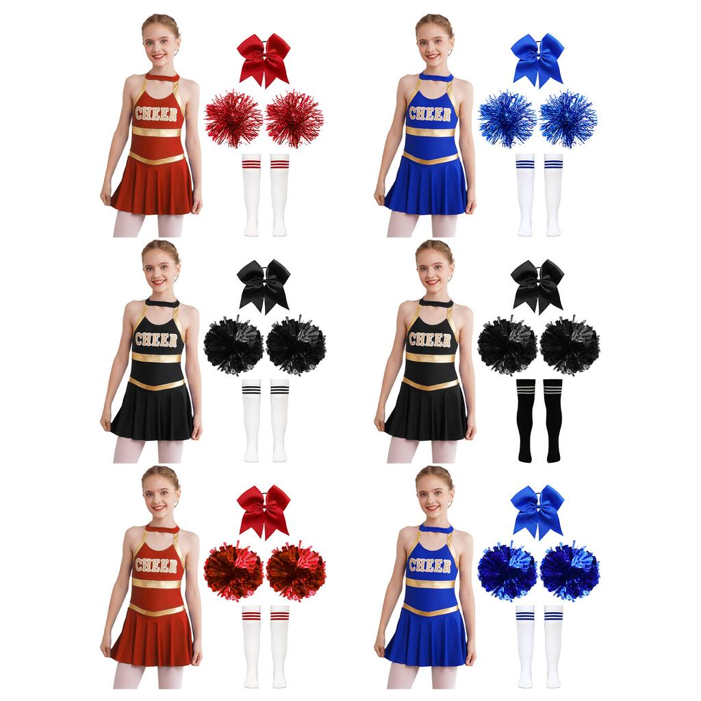 Детские костюмы группы поддержки для девочек, лоскутное танцевальное платье без рукавов с буквенным принтом, головные уборы с бантом и цветами, полосатые носки-трубочки