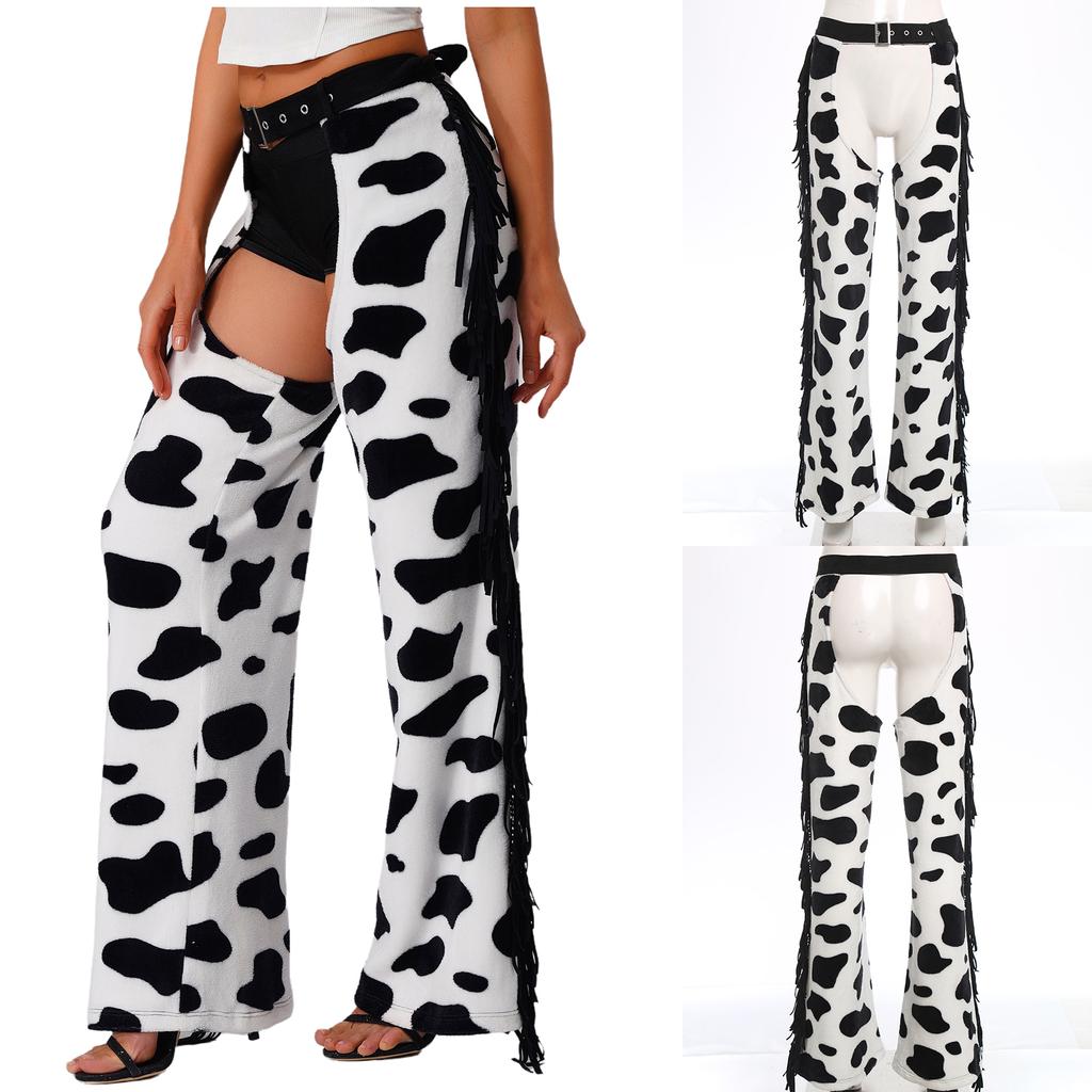 Велосипедные брюки-чапсы для женщин - Фланелевые длинные брюки с принтом коровьих пятен и боковой бахромой, регулируемая талия и открытая промежность