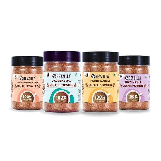 Bevzilla 50 грамм X 4 пакетика ароматизированного растворимого кофе. Коробка с ароматами Colombian Gold, Фундук, Ваниль | Идеально для эспрессо, латте и капучино