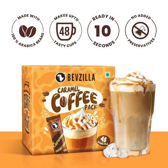 Bevzilla 48 пакетиков растворимого кофе (карамель) - 96 грамм | На 48 чашек | Кофе Арабика | Крепкий кофе | Лучший для эспрессо, латте, капучино
