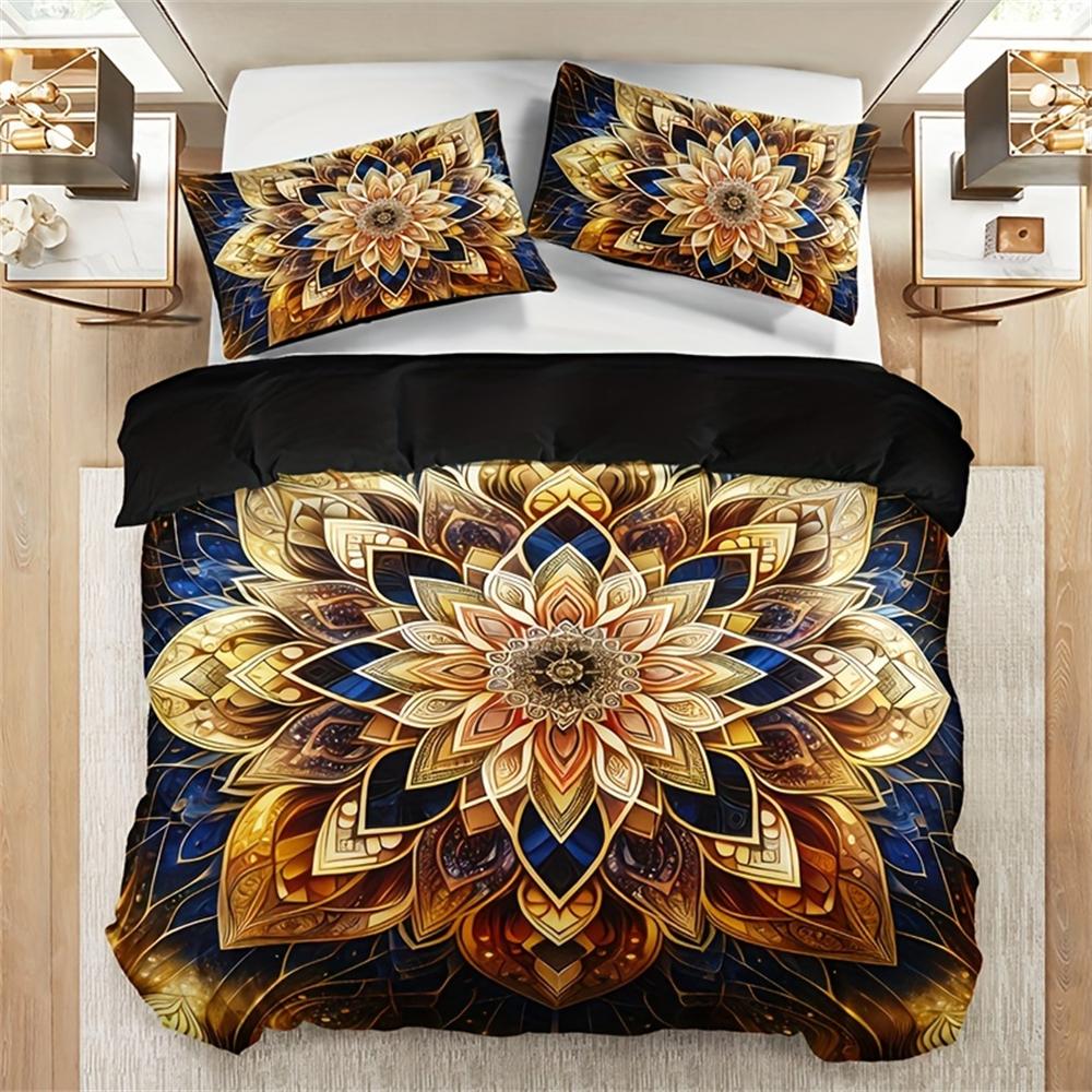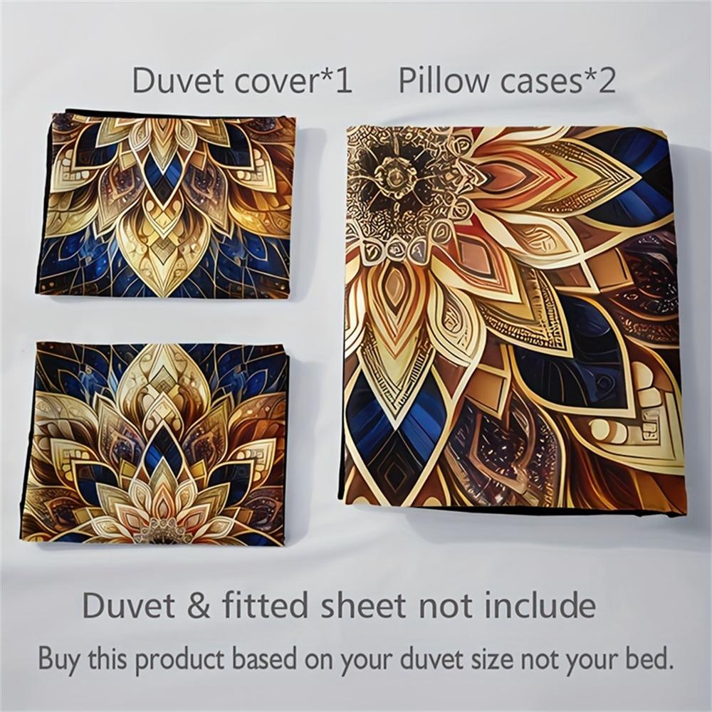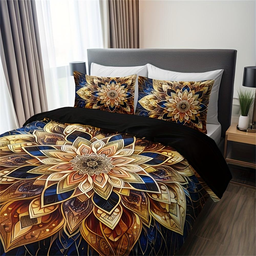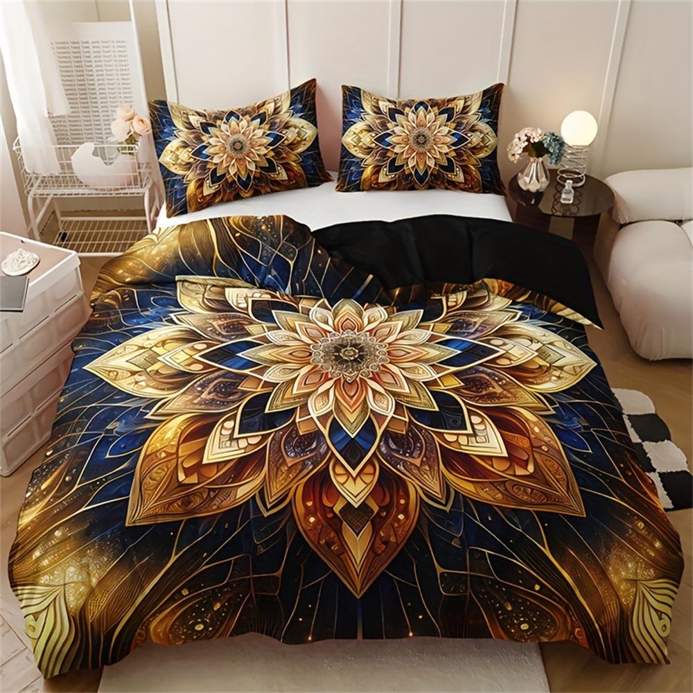 Золотистая мандала с цветочным узором, комплект пододеяльника из 3 предметов с 2 наволочками - Дышащий полиэстер, Всесезонный, Машинная стирка