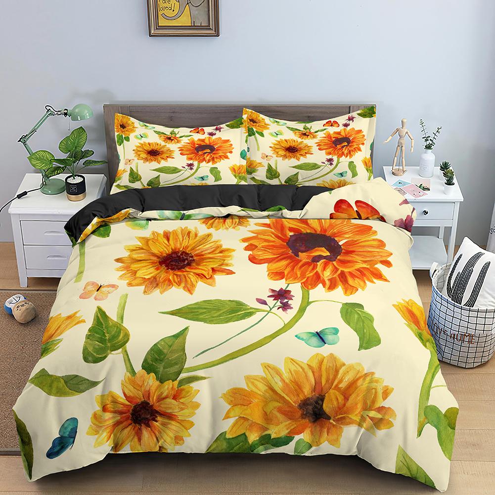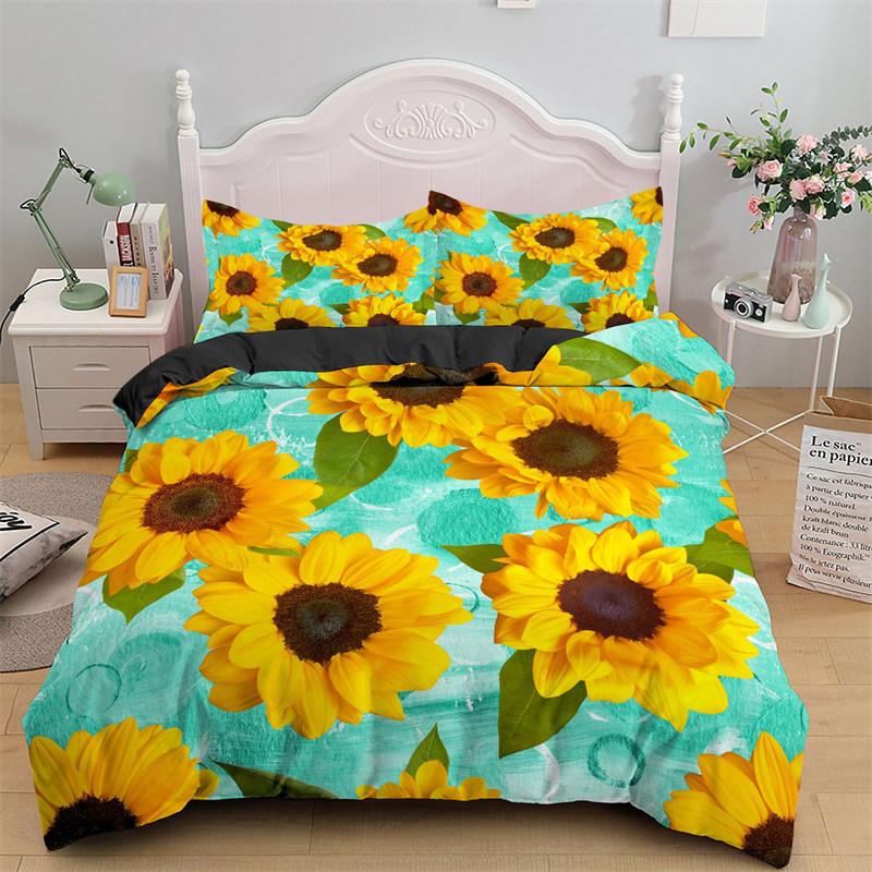 3D Пододеяльник с изображением подсолнуха King Queen, комплект постельного белья с желтыми цветами, цветочные зеленые листья, покрывало из 2/3 предметов из полиэстера, пододеяльник