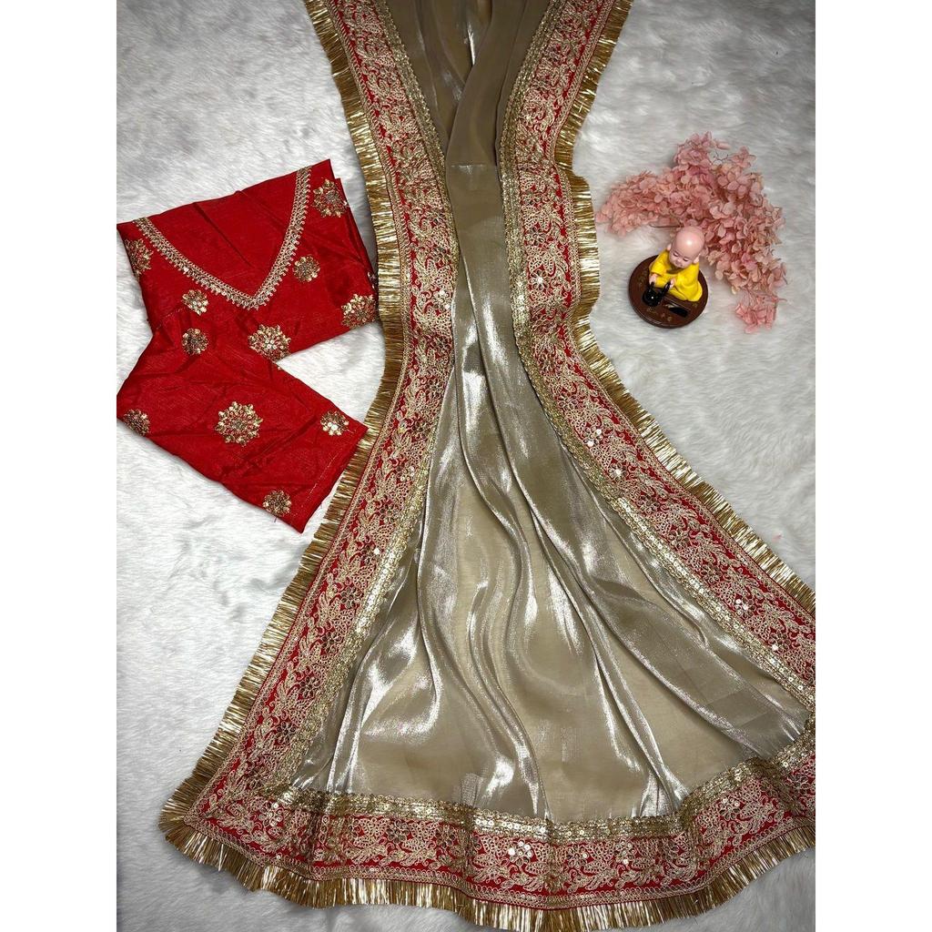 2)Ткань сари : Мягкая шелковая ткань Space с дизайнерским вышитым кружевом с пайетками и готовым кружевом