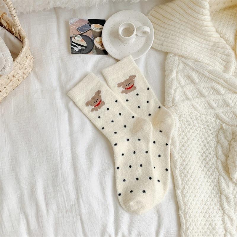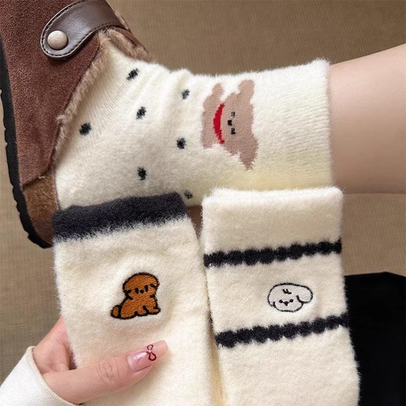 Модные женские флисовые носки средней длины до икры, осенне-зимние, в полоску, с вышитым мультяшным рисунком щенка, милые напольные носки Academy.