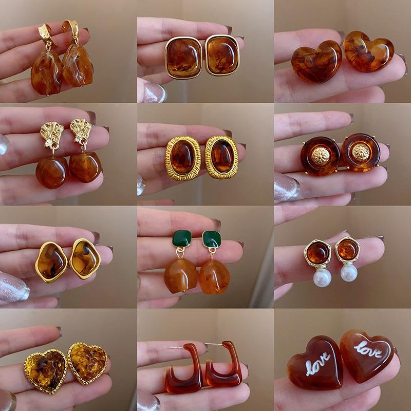 Серьги-пусеты неправильной формы коричневого цвета 'Серебряная игла' - Французская легкая роскошь, ретро, нишевые, высококлассные украшения для женщин.