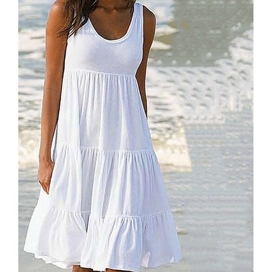 Летние платья больших размеров Модная одежда Женское повседневное платье без рукавов Свободные платья Однотонное А-силуэтное платье Хлопок Круглый вырез С открытыми плечами Холтер