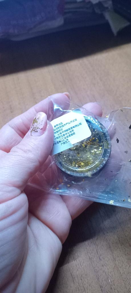 Продукт понравился : баночка наполнена почти полностью - материала много ; цвет зеркальный и у золота, и у серебра ; хлопья , разного размера ; тонкие , отлично перекрываются даже в один слой , но для гарантированной носки , лучше 2-а ; полагаю, что без труда можно "залить " весь ноготь и получить подобие зеркального дизайна - под серебро серебряную с липк. слоем , под золото , золотую с липк.слоем и плотно перекрывать поверхость ; сейчас не могу сказать работают хлопья как втирка , но если получится будет оч.круто . Попрбую - обязательно отпишусь и выложу .